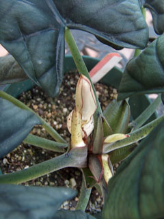 This jewel of an Alocasia is known by at least two names in the trade. We have both of the plants in our collection and, although they are quite similar in some ways, they are different in others. The Alocasia reginae 'Miri' is available from Malesiana Tropicals, while the plant known as Alocasia nebula 'Elaine' is available from Agristarts. The plant known as 'Elaine' grows more slowly, at least for us, and is a smaller plant overall, than the 'Miri'. The 'Elaine' also has a lighter bluish coloration pattern on the upper sides of the leaves, and a fainter reddish coloration on the undersides. As can be seen above, the undersides of 'Miri' are quite dark red in color, while the upper sides of the leaves are a much darker green with just a bluish tinge to them. As with all of the jewels, this plant must not be overwatered and should not be exposed to temperatures below 60 degrees Fahrenheit.
