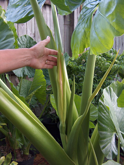 This is a variant of A. macrorrhizos that we acquired in late summer of 2004. Initially, it was just a pup that looked no different from any other green A. macrorrhizos we have seen and/or grown. As it grew in size, however, the plant evidently showed itself to be a far heavier, more vigorous variety. In fact, now that the plant has reached blooming size (after less than a year), in size it rivals our Alocasia "Borneo Giant", and may be a variant of that plant. One significant difference is the size of the "Big Mac" inflorescences, the longest of any Alocasia we have had the opportunity to study. When fully mature, they are 18" or more from base of spathe to tip, and the spadices produce copious amounts of fertile pollen, unlike the A. "Borneo Giant", which produces somewhat shorter inflorescences with a more modest amount of pollen shed.