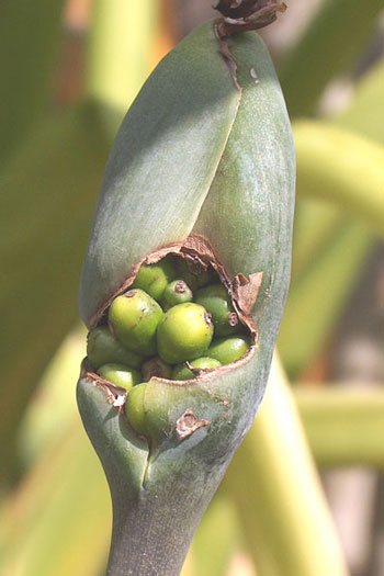 The bottom picture is a ripening head of berries on one of our Alocasia odora "Blue". These are what we euphemistically call a "double cross" because when we have only a limited number of blooms, we may decide to place pollen from two different parents on the same inflorescence. When we do this, we select two parents with divergently different characteristics so that we stand a good chance of distinguishing the progeny, should both crosses take and we end up with a mixture of fertile seeds. We also place one type of pollen on one side of the spadix and the other type on the remaining side.