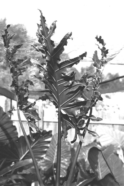 Illustrated here in black and white is the actual pollen parent we used to produce the hybrid Alocasia x portora. The female parent was, of course, Alocasia odora.
